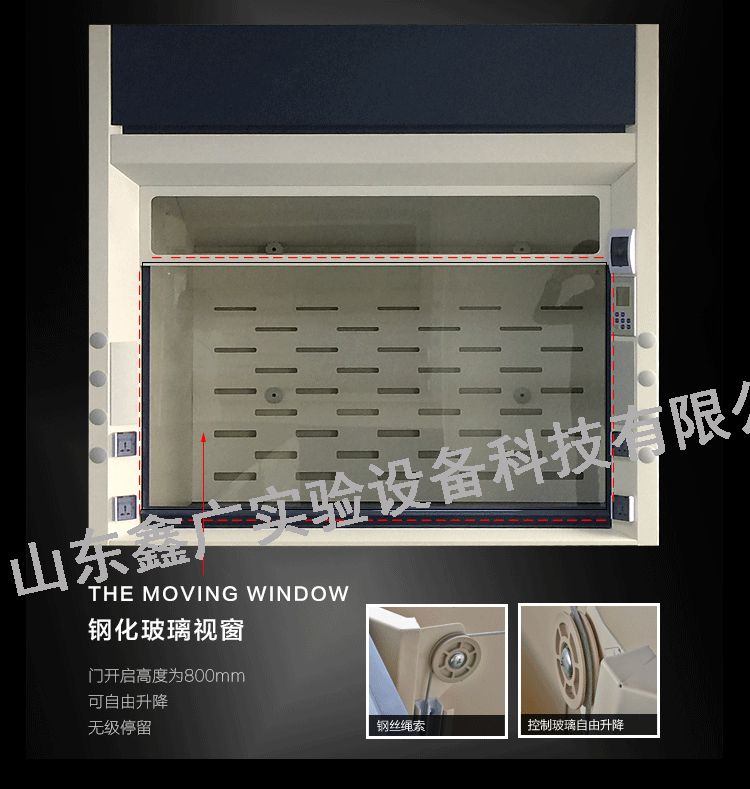 3、移動視窗:5mm優質鋼化玻璃,門開啟高度為700mm,自由升降,移門上下滑動裝置采用電梯配重方式結構,無級任意停留,移門導向裝置由抗腐蝕的聚氯乙稀材質構成。移門把手PP一體成型制作,移門旁邊是抗化學腐蝕的塑料包裹,移門的開、閉有橡膠緩沖裝置。